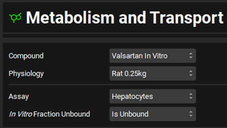 Select Valsartan In vitro from the Compounds drop-down and Rat 0.25kg from the Physiology drop-down. Select Hepatocytes from the Assay drop-down and set the In Vitro Fraction Unbound to “Is Unbound”.